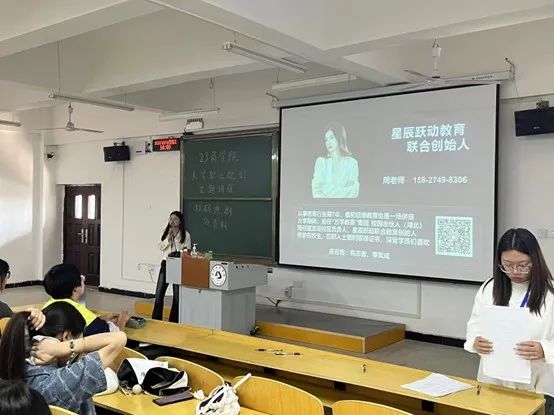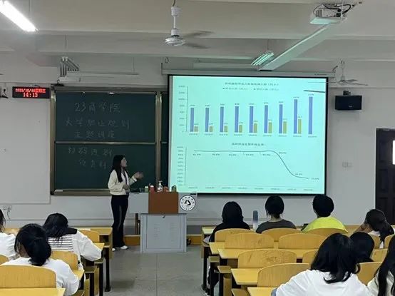 在分享会上,周老师根据历年毕业生就业率和考研率对老员工职业规划也进行了讲解。周老师结合自身经历向同学们提出合理规划时间的建议,鼓励大家刻苦学习,不辜负自己的抱负和未来。