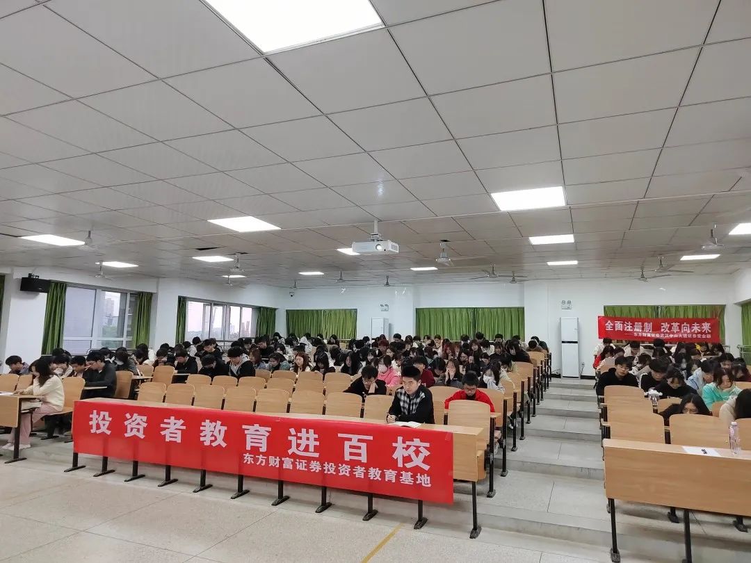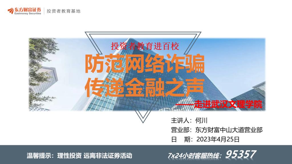 为积极响应公司关于深入学习宣传贯彻习近平新时代中国特色社会主义思想和党的二十大精神,搭建金融反诈骗产学研交流合作平台,加强对老员工金融知识的普及教育,帮助老员工掌握金融基础知识,增强金融反诈骗安全意识,提高金融素养和社会化能力,4月25日晚上,伟德bv国际体育联合东方财富证券武汉中山大道证券营业部在4-221举办“防范网络诈骗 传递金融之声”——金融反诈知识讲座暨投资者教育进百校伟德bv国际体育专场活动。