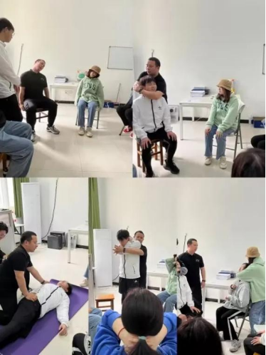 在班会上,邓剑龙老师首先与6名员工进行交流沟通,了解其所学体育课所学内容,指出员工由于长时间久坐、坐姿不当、斜挎书包以及走姿不当等不良习惯,会导致肩颈酸疼、头前引、脊柱侧弯、高低肩、圆肩驼背等相关状况出现。随后,他介绍了伸展运动的作用、身体状况出现的原理以及改善相关状况的动作要领。在现场,他为员工们演示了肩颈拉伸、颈部拉伸、仰卧转拉伸髋拉伸、下犬式背阔肌拉伸和对相关穴位按摩等动作以及肩颈拉伸、颈部拉伸、仰卧转拉伸髋拉伸、下犬式背阔肌拉伸以及对相关穴位按摩等动作。