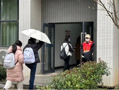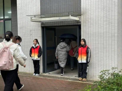 在清晨的校园中,纠察队的员工们身着整齐的制服站在教学楼的门口,他们的目光锐利而坚定。分团委书记和团学主席团成员为了保证此次志愿服务顺利完成,也在各站岗处来回巡查监督。