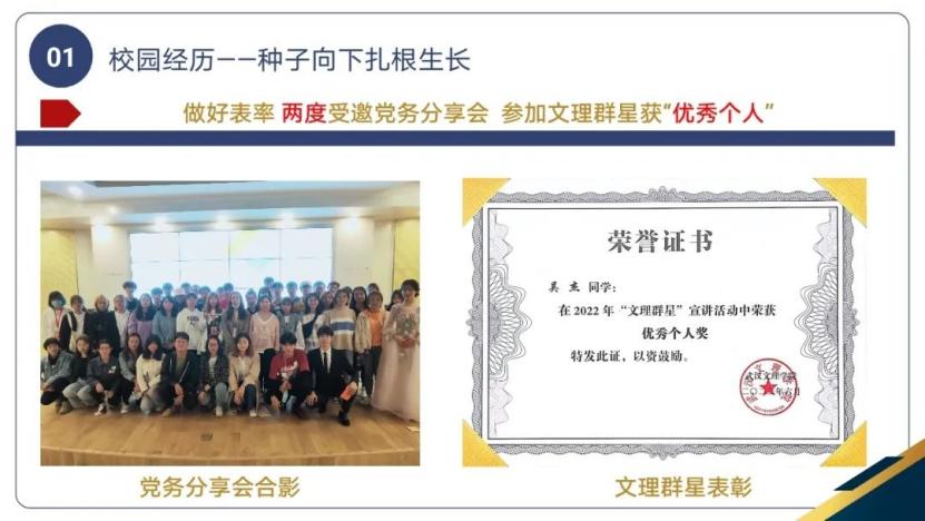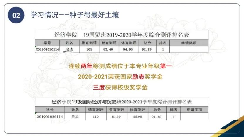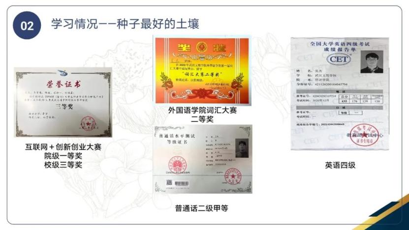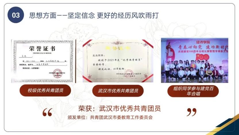 吴杰在工作做好的同时在学习上也是勤学刻苦,积极投入学科竞赛并收获良多。在伟德bv国际体育国际经济与贸易系,吴杰连续两年综合测评排名位列专业第一,连续三年获得校级奖学金,获得国家励志奖学金。在学科竞赛方面,吴杰作为队长带队参加“互联网+”创新创业大赛荣获院级一等奖,校赛三等奖;个人参加伟德bv国际体育词汇大赛获得校二等奖。期间,顺利通过英语四级考试和普通话二级甲等。2022年,吴杰荣获校“优秀共青团员”和武汉市“优秀共青团员”称号。