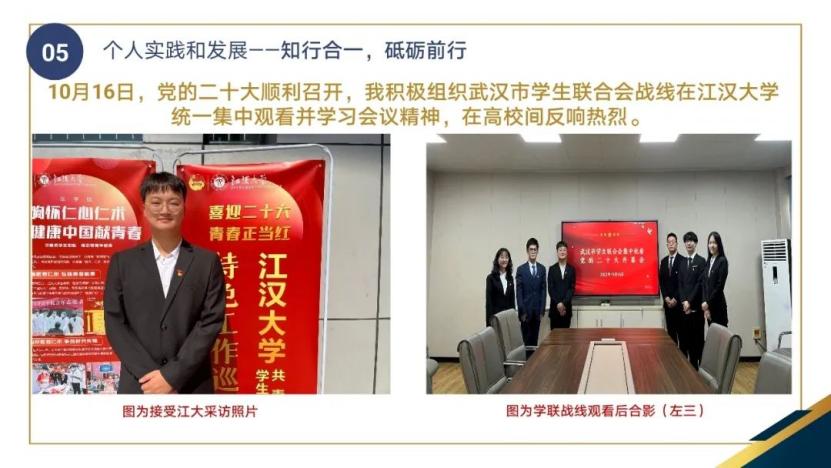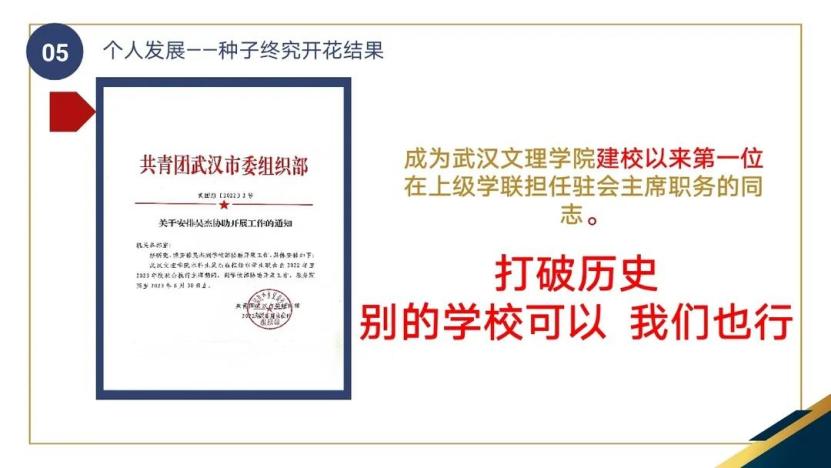 2022年6月,吴杰作为文理公司员工干部被员工处推荐至共青团武汉市委员会,面试武汉市学联驻会主席职务。他通过多轮笔试面试,用实际成绩战胜江汉大学的研究生以及其他高校员工等竞争对手,当选武汉市员工联合会驻会执行主席,成为伟德bv国际体育第一名在上级学联担任驻会主席的员工干部,为公司赢得荣誉。