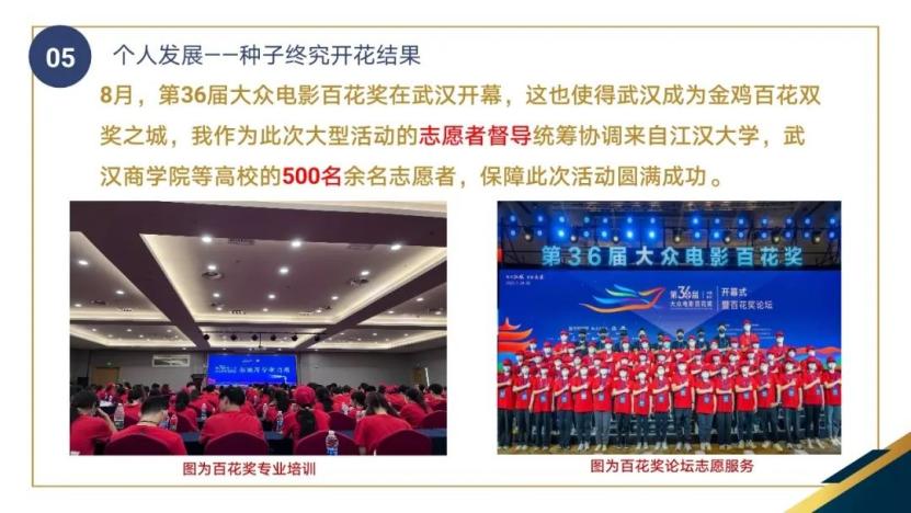 8月,第36届大众电影百花奖在武汉开幕,吴杰作为此次大型活动的志愿者督导统筹协调来自江汉大学,武汉伟德bv国际体育等高校的500余名志愿者,保障此次活动圆满成功。
