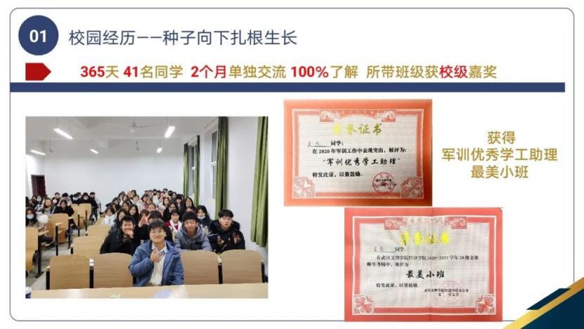 好的员工干部要懂得工作方法。2020年9月,吴杰通过竞选担任2020级国际经济与贸易班员工班主任,他协助辅导员花两个月的时间通过近距离聊天仔细了解了41名同学的家庭情况,高度凝聚班级的向心力,有效推动班级班风和学风建设。2020年上半年因员工班主任工作突出,吴杰个人荣获“军训优秀学工助理”,“最美小班”荣誉称号。