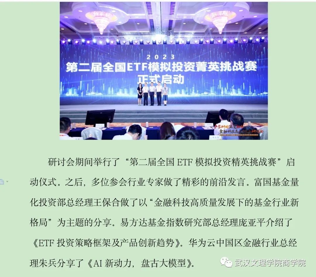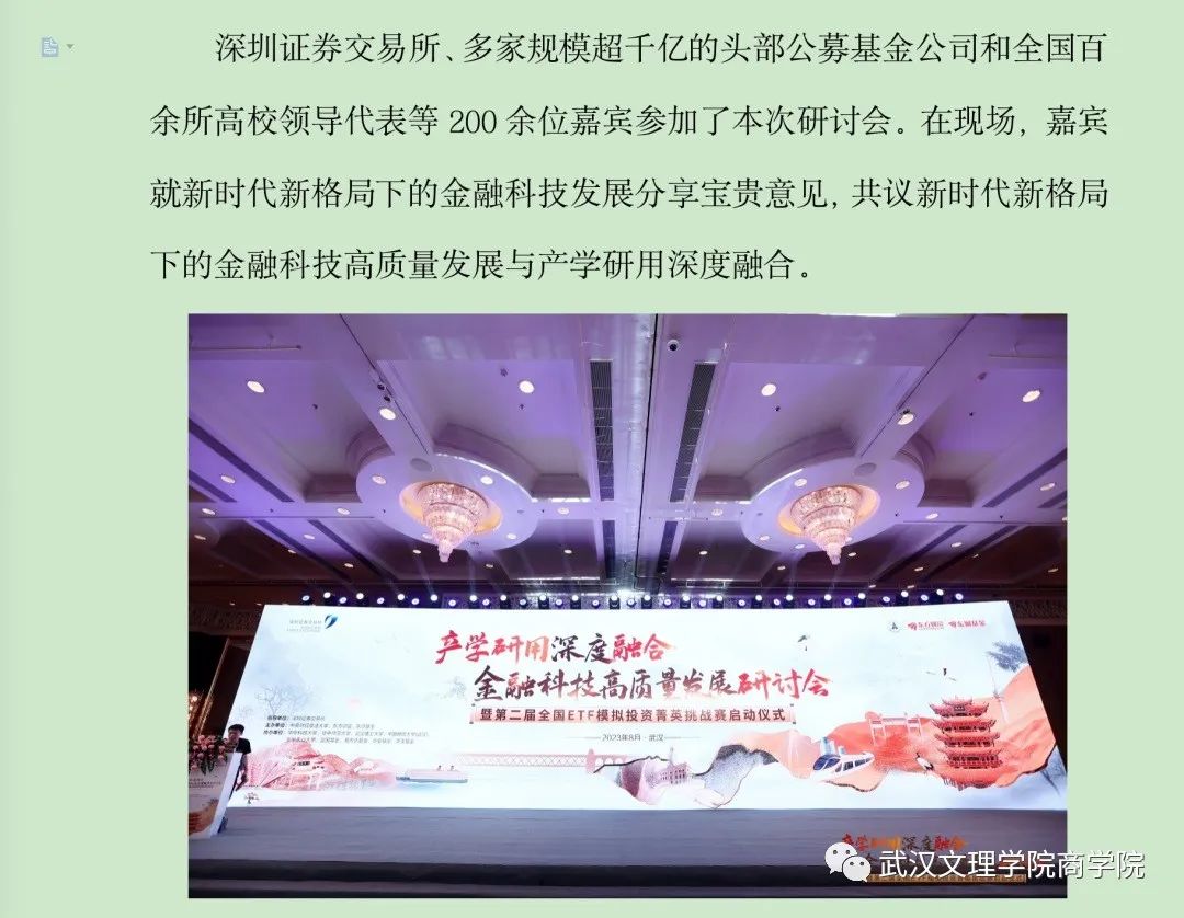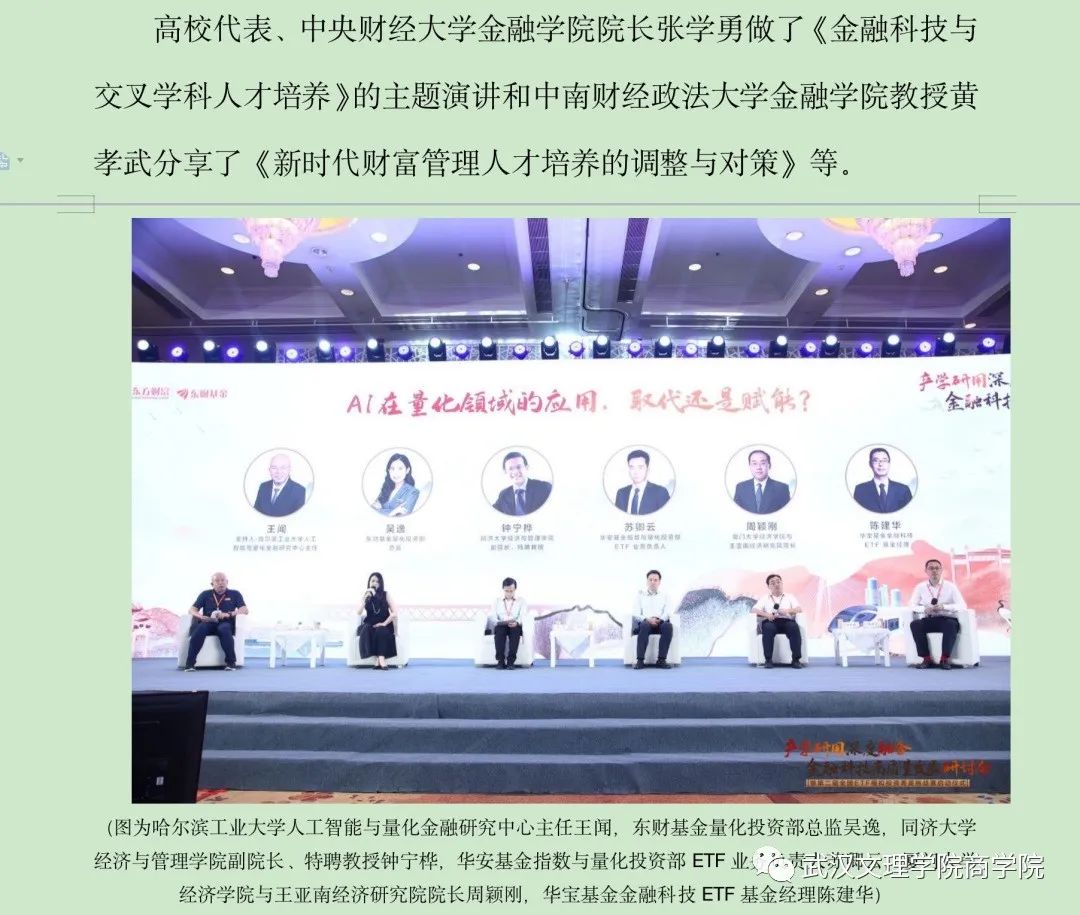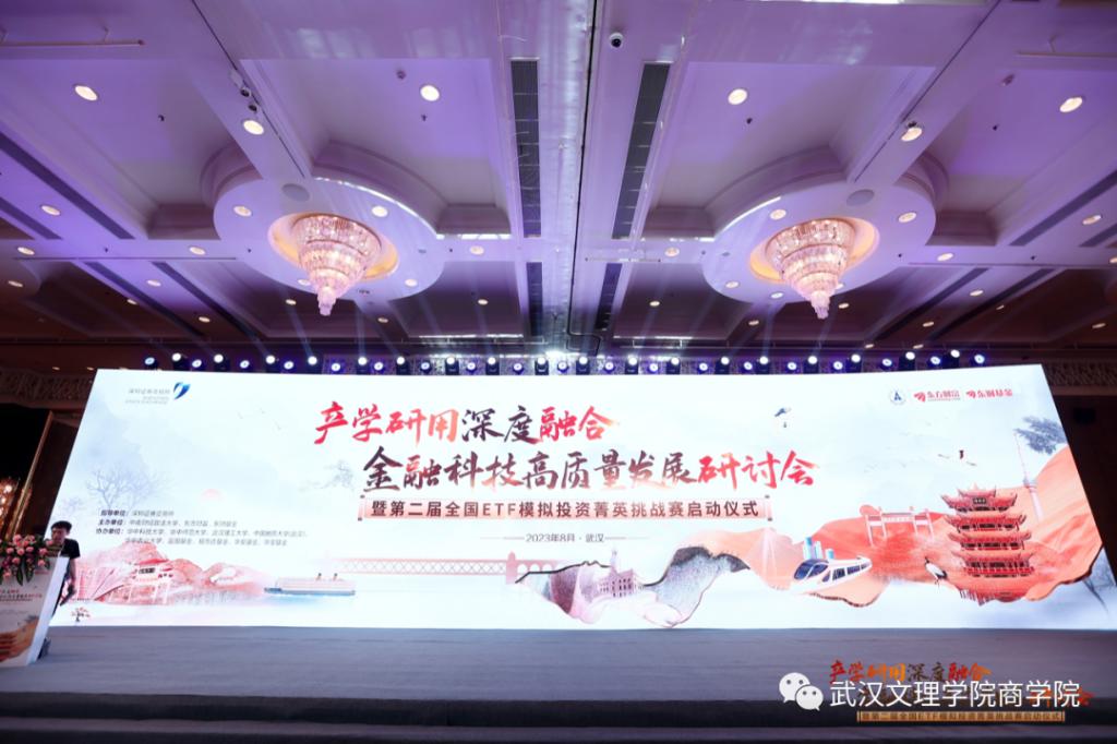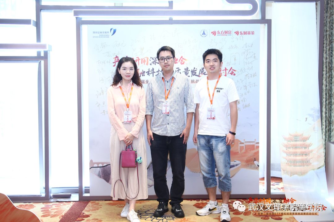 8月11日,为了解业界新技术和企业用人新需求,切实推进校企合作,加大产教融合步伐,优化应用型人才培养体系,拓展伟德bv国际体育实习实践基地,伟德bv国际体育教学副经理刘炫、投资系主任刘圣龙、副教授汪笛晚在武汉应邀参加了由深圳证券交易所指导,中南财经政法大学、东方财富、东财基金联合主办的“产学研用深度融合 金融科技高质量发展”研讨会暨2023年第二届全国ETF模拟投资菁英挑战赛启动仪式。